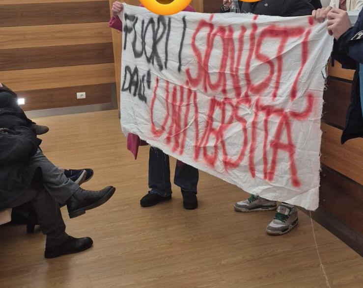 Ad un certo punto, un gruppo di studenti ha interrotto l’evento, srotolato uno striscione con scritto “Fuori i sionisti dall’Università” e contestato Gori, che nelle settimane precedenti aveva difeso il parlamentare del suo partito Emanuele Fiano, a sua volta contestato all’Università di Venezia in un incontro tenuto da “Sinistra per Israele”.